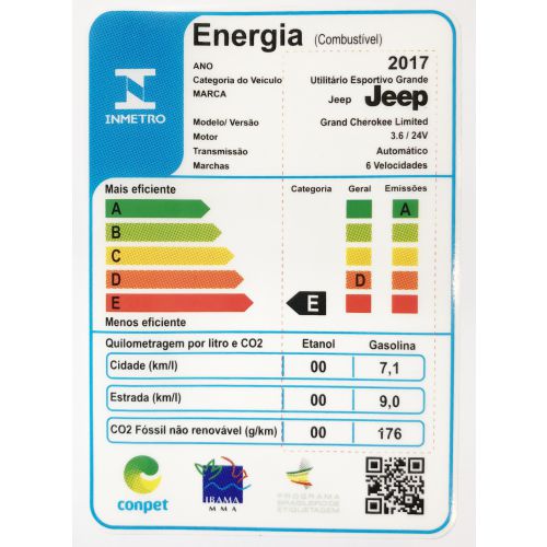 ETIQUETA INMETRO DE EFICIENCIA ENERGETICA GRAND CHEROKEE GAS LIMITED 2018