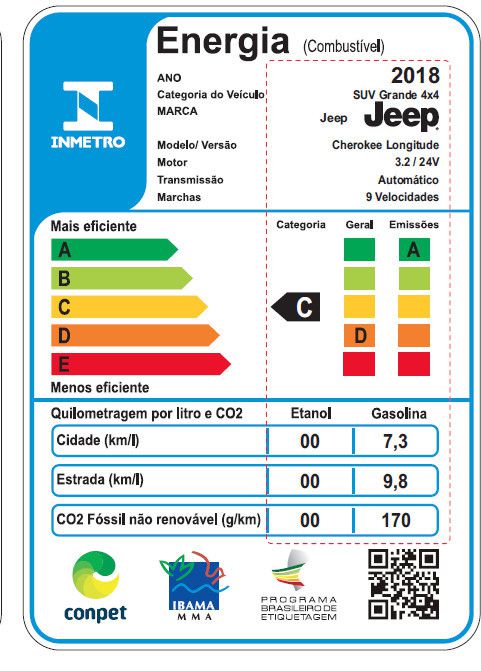 ETIQUETA INMETRO DE EFICIENCIA ENERGETICA CHEROKEE LONGITUDE 2018