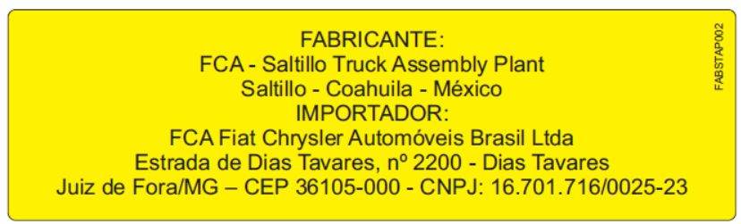 Etiqueta Fabricante FCA - Saltillo Truck Assembly Plant